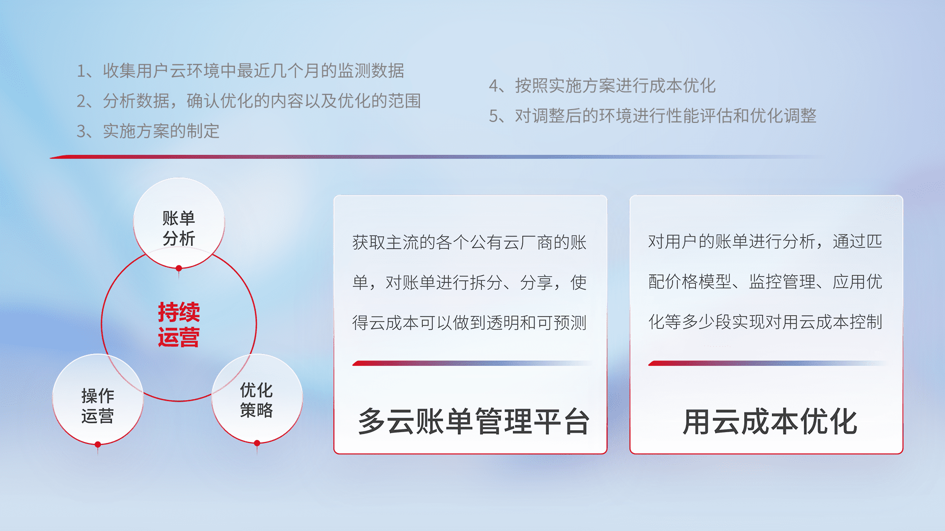 通过多云纳管,,,以统一的资源数据模型把客户的云资源进行抽象和封装,,进而实现对多云资源的统一操作,,,,保障云资源管理的可靠性、、、、稳定性与可用性。。。量身定制化运维内容,,配置、、、开发运维、、、补丁管理、、备份、、监控、、、认证和访问管理、、、、审计和日常巡检等,,保障在用云过程中的可靠度,,稳定度以及高可用率。。
